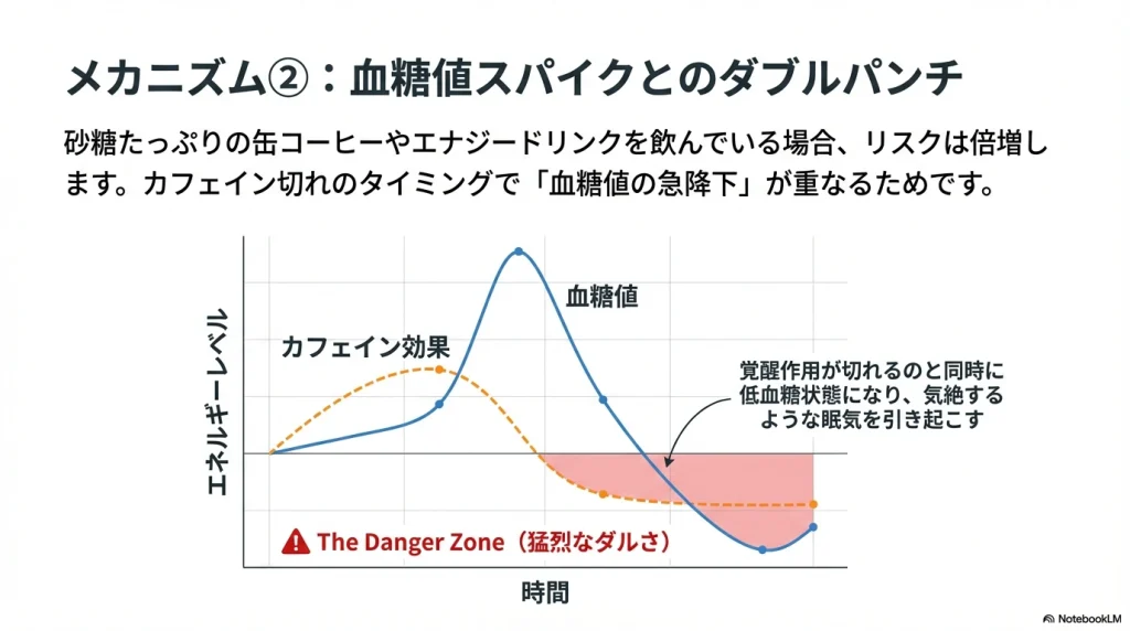 砂糖たっぷりの缶コーヒーやエナジードリンクを飲んでいる場合、カフェイン切れに加えて「血糖値の急降下」も重なり、眠気やだるさがさらに悪化しやすくなります。これを「血糖値スパイク」と呼び、ダブルパンチで体調を崩す要因となります。