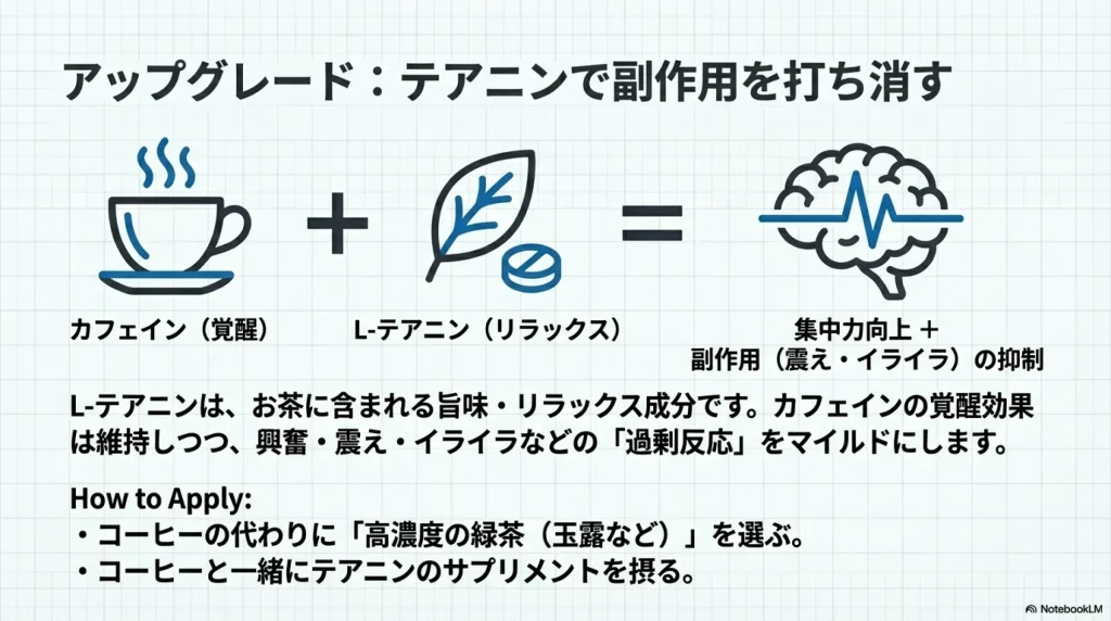 テアニンをカフェインと一緒に摂取することで、覚醒効果は維持しつつ、切れた時の急激な反動やイライラ、手の震えなどを防ぐ効果が期待できます。実際に、カフェインとテアニンの併用は、集中力の向上においても相乗効果があるという研究もあります。対策としては、コーヒーの代わりにテアニンが豊富な高濃度の緑茶(玉露やかぶせ茶など)を選んだり、コーヒーを飲む際にテアニンのサプリメントを併用したりするのがおすすめです。