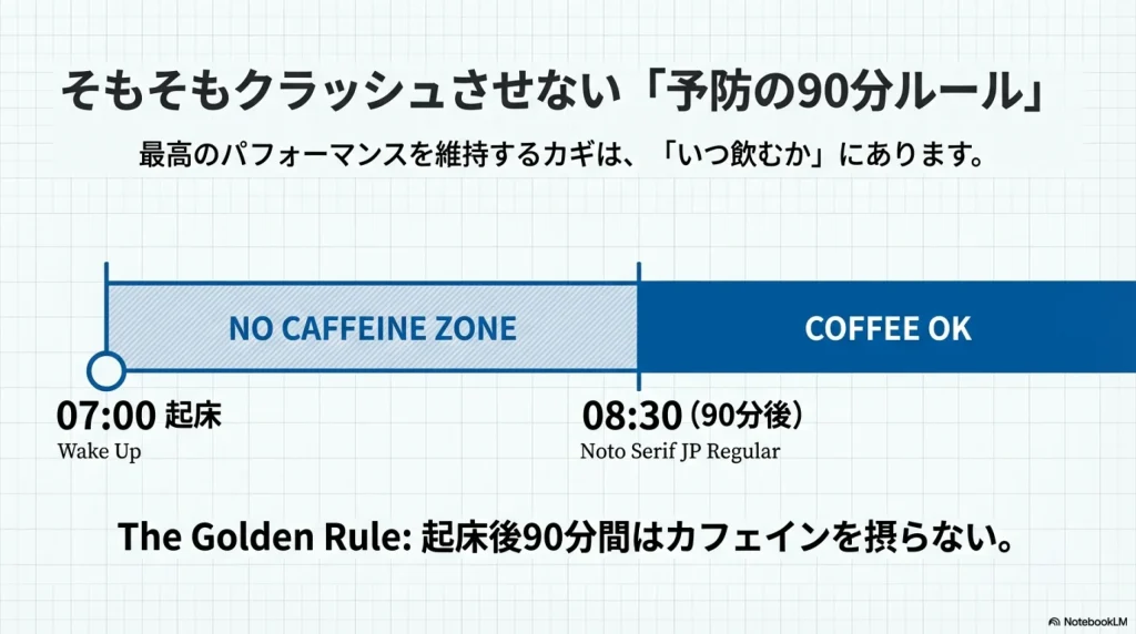 私が実践してみて最も効果を感じた予防策が、「起床後90分間はカフェインを摂らない」というルールです。