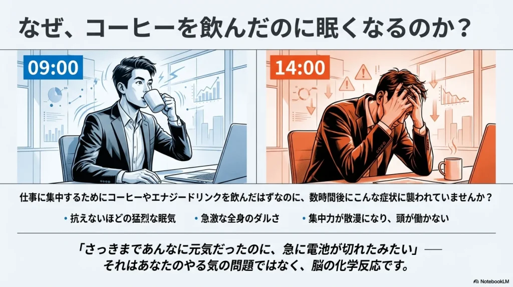 まずは、なぜあんなに急激に体が重くなったり、やる気がなくなったりするのか、その正体について見ていきましょう。敵を知ることで、今起きている不調への不安が和らぎますし、適切なカフェインクラッシュ対策が見えてきます。
