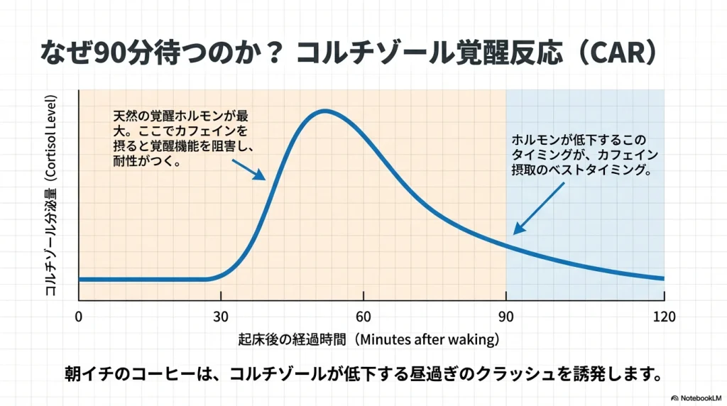 人間の体は、朝起きると自然に体を覚醒させるホルモン「コルチゾール」を分泌します。これを「コルチゾール覚醒反応(CAR)」と呼びますが、起床直後(0〜60分)はこの分泌がピークになります。このタイミングでカフェインを摂取すると、せっかくのコルチゾールの働きとバッティングしてしまい、体が「自分で覚醒する力」を弱めてしまいます。その結果、カフェインへの耐性がつきやすくなるだけでなく、コルチゾールが低下する昼過ぎに強烈なクラッシュを招きやすくなると言われています。