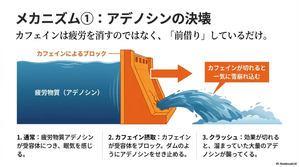 通常、私たちが活動している間、脳内にはアデノシンという物質が蓄積され、これが受容体にくっつくことで「眠気」を感じさせます。カフェインはこのアデノシンの構造と似ており、先回りして受容体をブロックしてしまいます。これにより、「疲れた」という信号が一時的に遮断され、脳が覚醒したと錯覚するのです。しかし、カフェインの効果が切れると、せき止められていた大量のアデノシンが一気に受容体へと雪崩れ込みます。これが、普段以上の疲労感として襲ってくるメカニズムです。