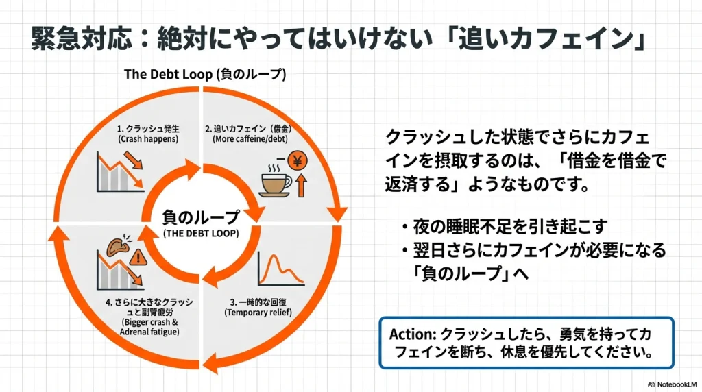 クラッシュした状態でカフェインを追加すると、一時的には回復したように感じますが、その後に訪れるクラッシュはさらに大きくなります。これは、借金を借金で返しているような状態で、最終的には破綻してしまいます。これを繰り返すと、副腎に過度な負担をかける「副腎疲労」を招いたり、夜眠れなくなって睡眠不足になり、翌日さらにカフェインに頼るという「負のループ」に陥ります。クラッシュした時は、勇気を持ってカフェインを断ち、休息を優先させることが大切です。