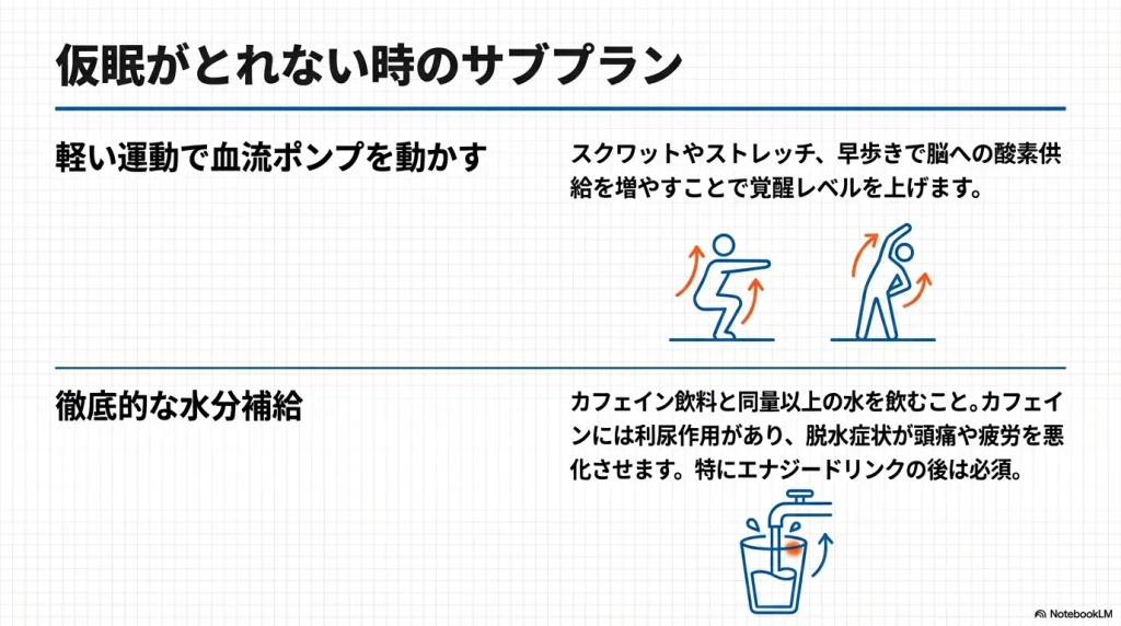 仕事中でどうしても仮眠がとれない場合は、軽い運動で血流を良くし、脳に酸素を送ることで覚醒レベルを上げるのが有効です。その場でスクワットをしたり、早歩きでトイレに行ったり、ストレッチをするだけでも気分転換になります。