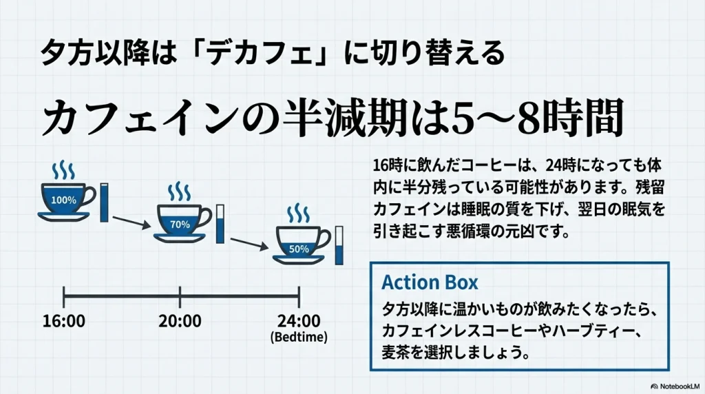 つまり、夕方16時に飲んだコーヒーのカフェインは、夜の22時や24時になってもまだ半分近く体内に残っている可能性があるのです。これが夜の睡眠の質を下げ、翌朝の目覚めを悪くし、結果として翌日の日中に眠気を招くという悪循環を生みます。夕方以降に温かい飲み物が欲しくなったら、カフェインレス(デカフェ)のコーヒーやハーブティー、麦茶などに切り替えましょう。最近のデカフェは味も香りも進化していて、十分に満足感がありますよ。