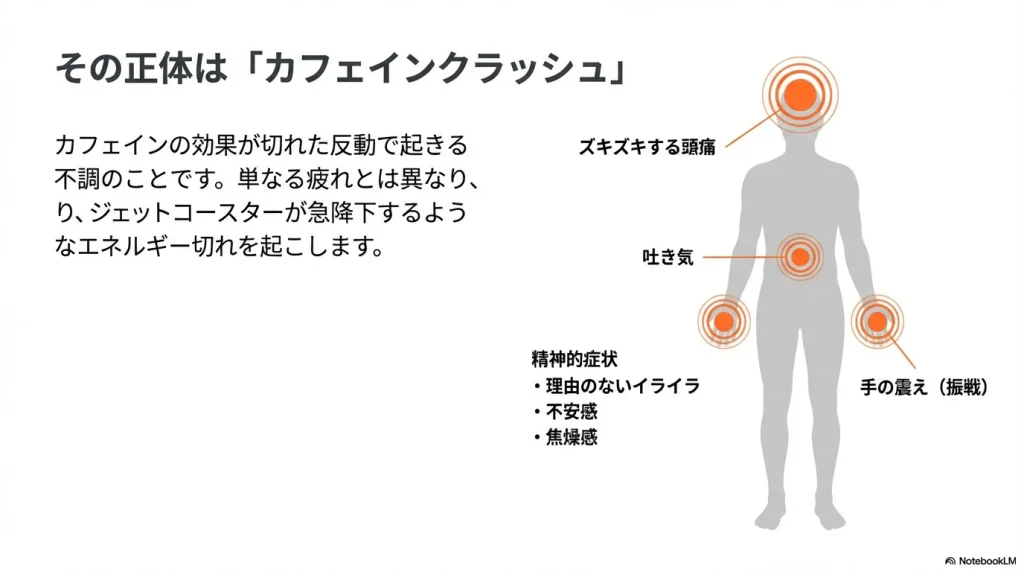 - カフェイン切れで起こる頭痛や吐き気などの具体的症状