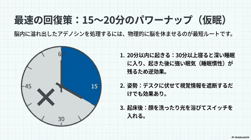 もし今、すでにクラッシュしてしまって辛い状況にあるなら、最も即効性のある治し方は「15〜20分程度のパワーナップ(仮眠)」です。