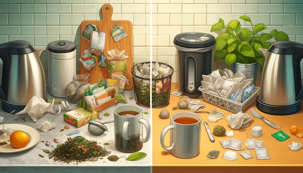 次に、ティーバッグも非常に便利です。ティーバッグは個別に包装されているため、使いたい分だけ取り出してお湯を注ぐだけで済みます。ティーバッグは急須や茶こしを使わずにお茶を楽しめるので、後片付けが楽です。特に忙しい朝や仕事中のリフレッシュタイムに最適です。